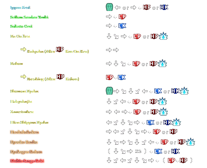 10-Move list of all the Arcade character include bosses 11-Include a non confirmed move list of the console characters 12-Correct command and names of some moves and put following. EX version hits up to 6. Startup includes the 1st active frame for the total frames of a move you have to do.